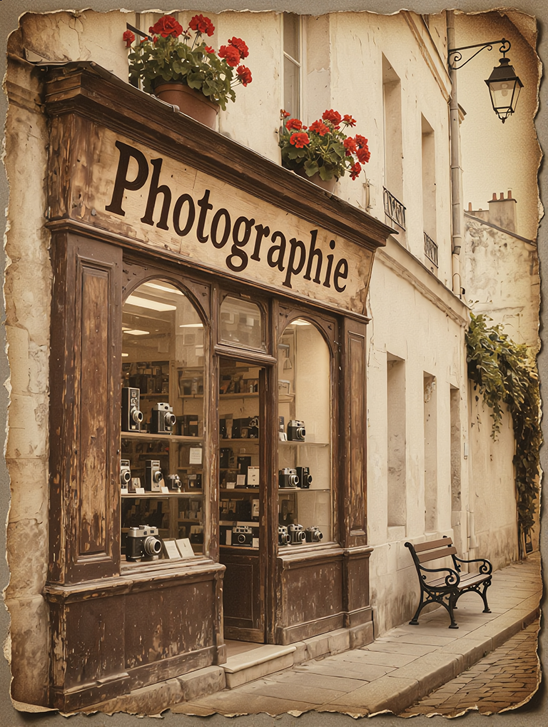 On y voit la devanture d’une petite boutique de photographie, au style d’un autre temps. L’image est légèrement abîmée, les couleurs passées, mais une adresse reste lisible, inscrite en bas.