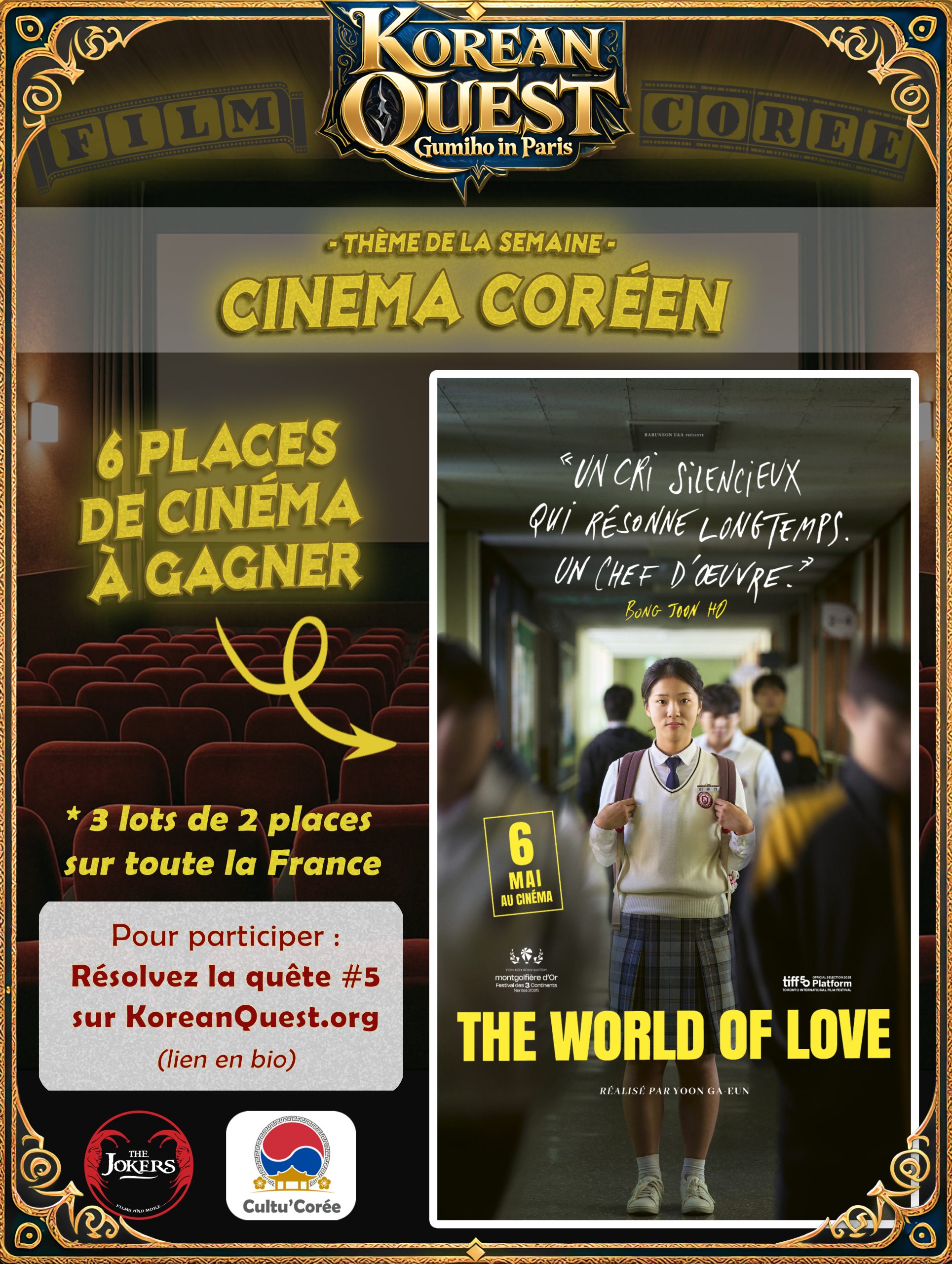 À l’occasion de la sortie prochaine du film « The World Of Love », The Jokers Films s’associe à Korean Quest pour vous faire gagner des places de cinéma. 🍿